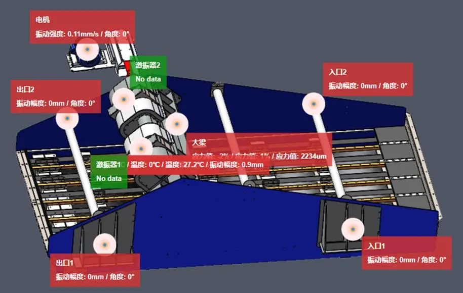 查看监测功能:显示设备监测的点位,以及监测部位的运行状态,点击监测点,能够定位并重点展示监测点的具体位置, 并将该监测设备的单点详细信息展示出来,比如温度和振动数值等,能够快速返回查看整体设备情况