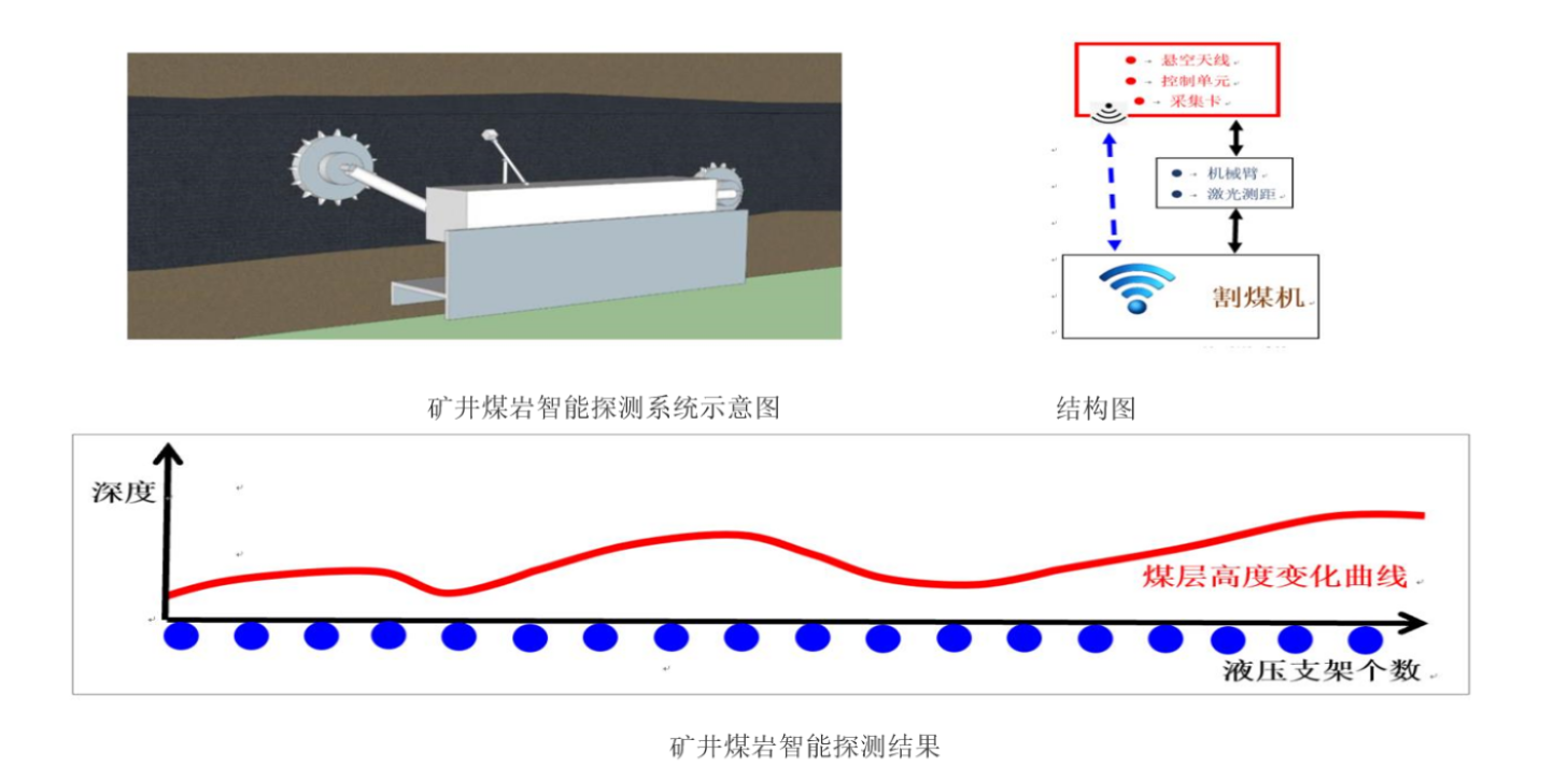系统重点突破矿井防爆屏蔽天线、煤岩识别等关键技术,开发出矿井煤岩智能探测系统。煤岩界面识别系统采用非接触式屏蔽天线,可实时动态的获取1.5m内的煤岩界面信息,探测精度达到2cm,从而能够有效的制定滚筒调高策略,为实现透明工作面、矿井智能化开采提供技术支持。