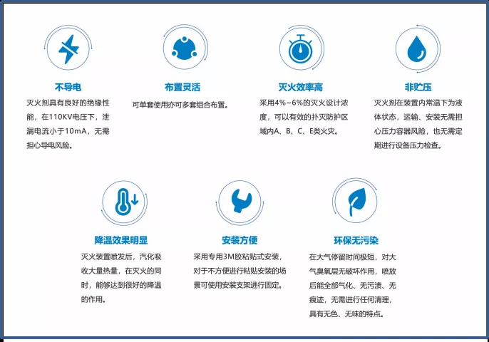 非储压式全氟己酮降温灭火装置具有不导电、布置灵活、灭火效率高、非贮压、降温效果明显、安装方便、环保无污染等特点。